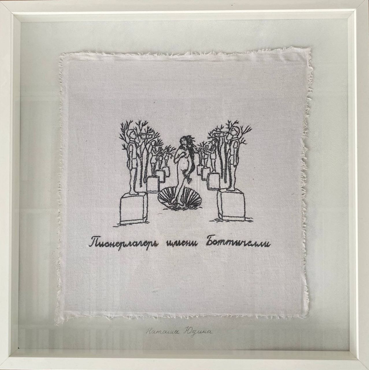 Natasha YudinaПИОНЕРЛАГЕРЬ ИМЕНИ БОТТИЧЕЛЛИ, 2017Вышивка на ткани, крахмал, картон, рама, стекло38 x 36 cm