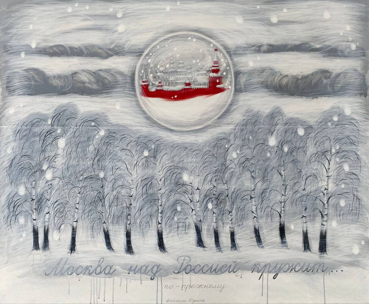 Natasha YudinaМОСКВА НАД РОССИЕЙ КРУЖИТ ПО-ПРЕЖНЕМУ, 2026Холст, масло, белая рама100 x 120 cm