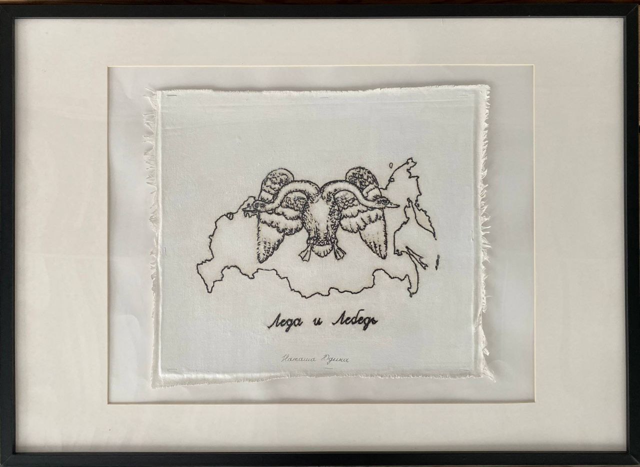 Natasha YudinaЛЕДА И ЛЕБЕДЬ, 2021Вышивка на ткани, крахмал, акрил, картон, рама, стекло37 x 37 cm